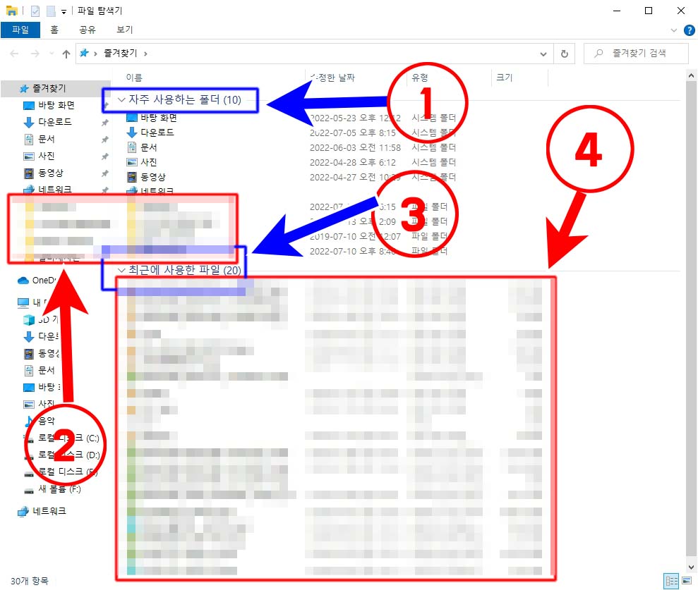 파일 탐색기의 즐겨찾기에서도 ①최근에 자주 사용하는 폴더②, ③최근에 사용한 파일④을 보여줍니다.