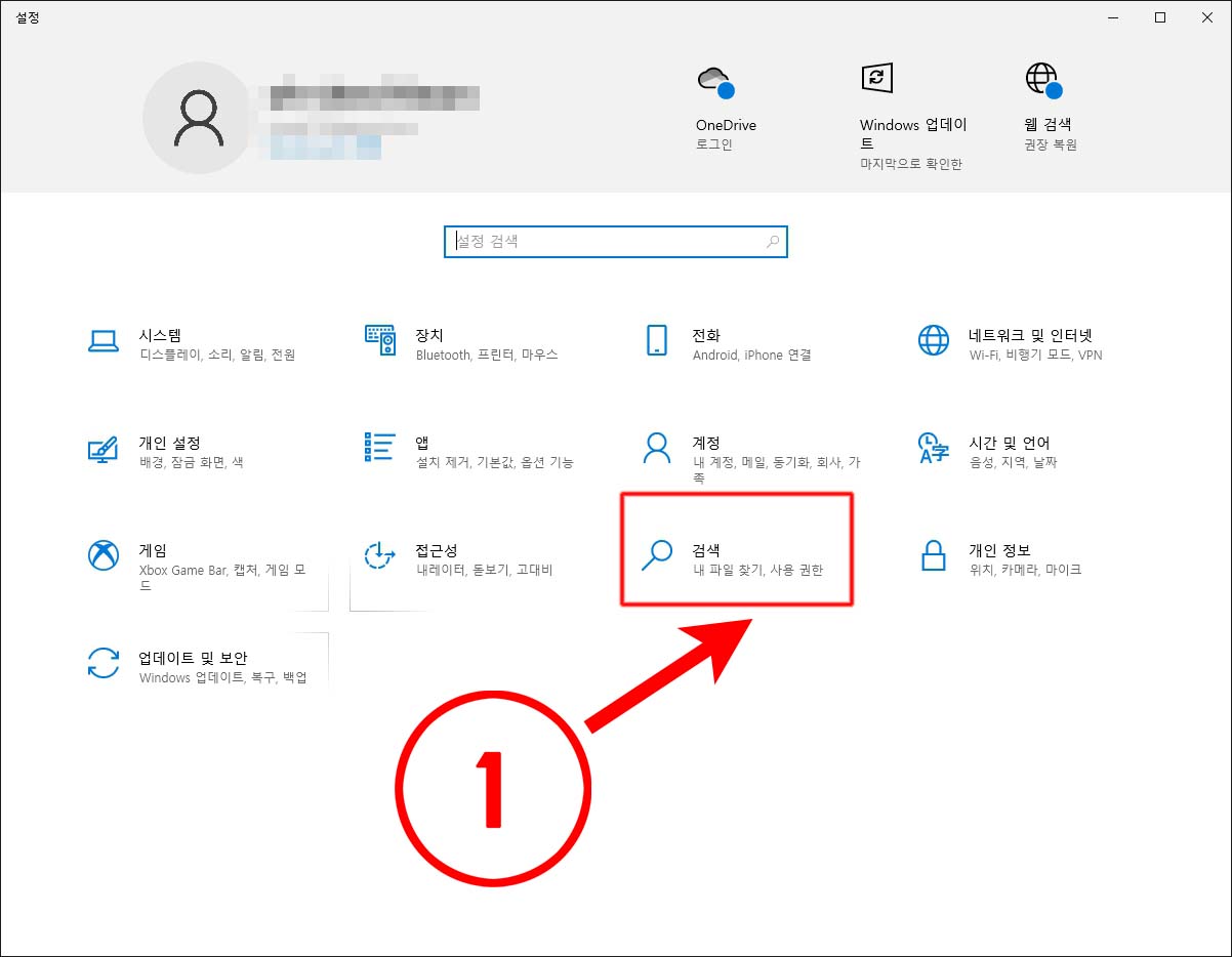 설정 화면으로 들어왔으면 ①[검색(내 파일 찾기, 사용 권한)] 메뉴를 클릭합니다.