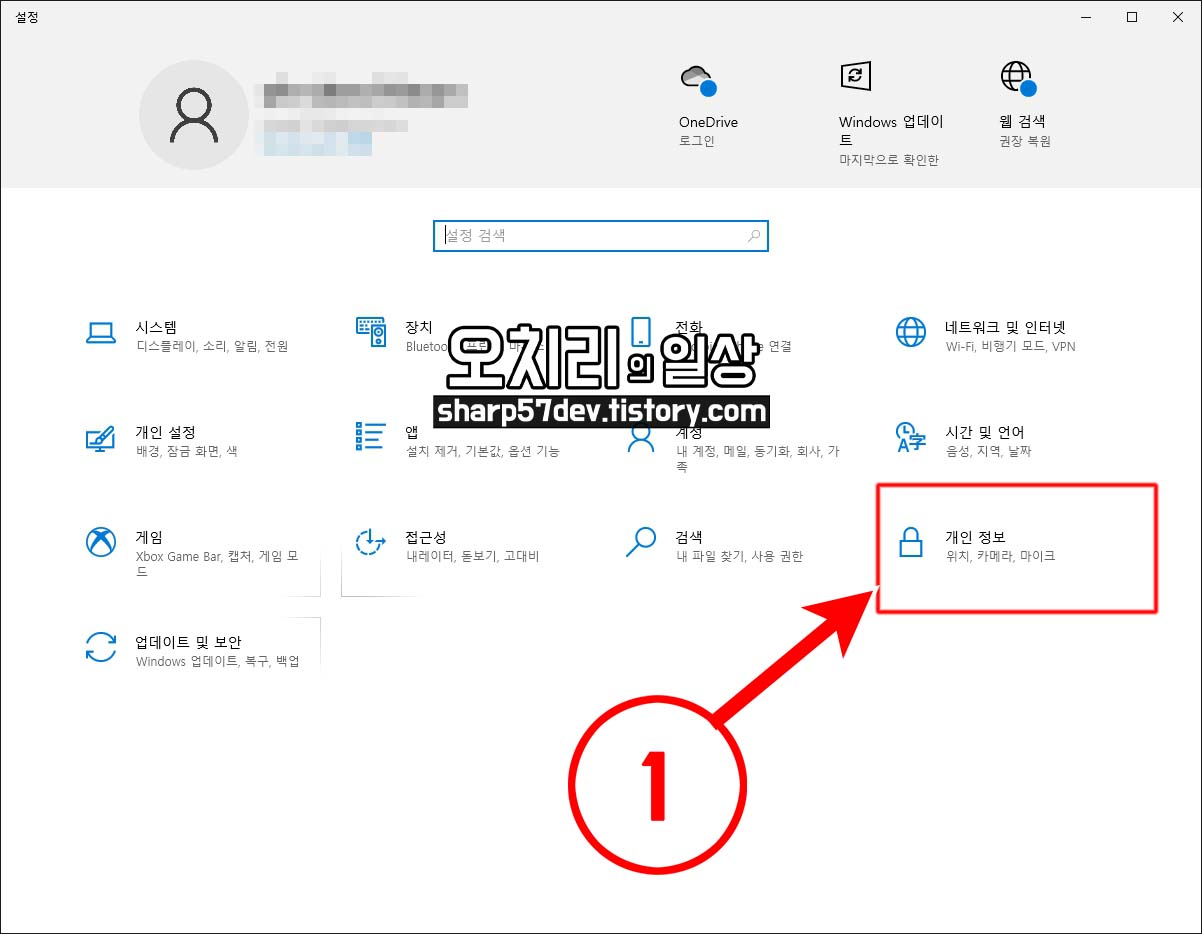 설정창에서 ①[개인정보(위치, 카메라, 마이크)]를 클릭합니다.