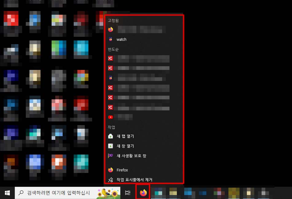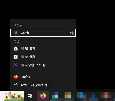 아까 있었던 작업표시줄에 있는 프로그램의 마우스 우클릭 시 최근에 연 항목은 물론 아무 항목도 뜨지 않습니다.