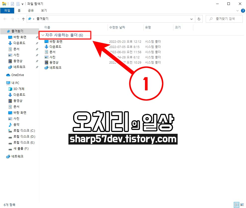 파일 탐색기에서도 ①[자주 사용하는 폴더(기본 폴더)]만 남고 다른 것들은 모두 삭제되었음을 알 수 있습니다.