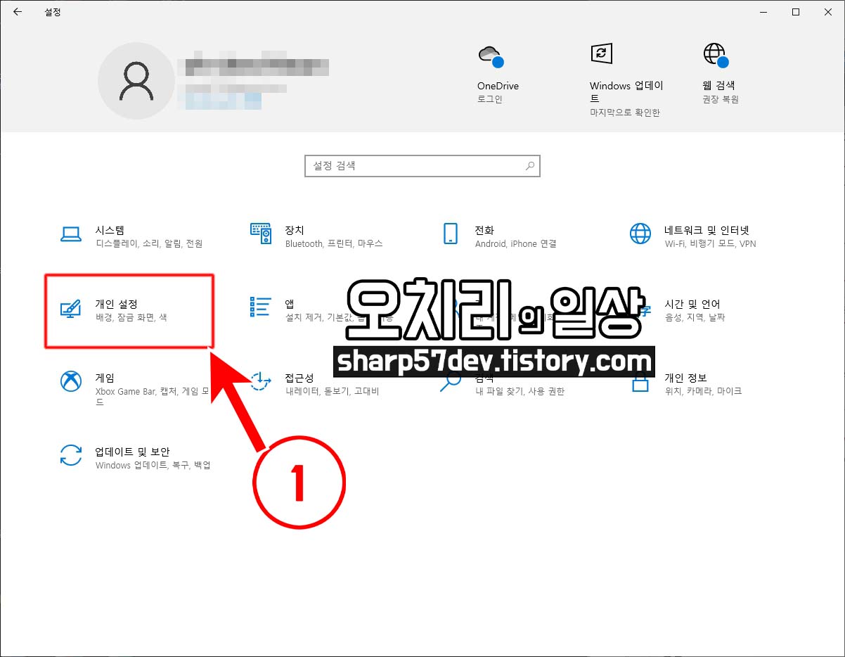 설정창에서 ①[개인설정]을 클릭하여 들어갑니다.