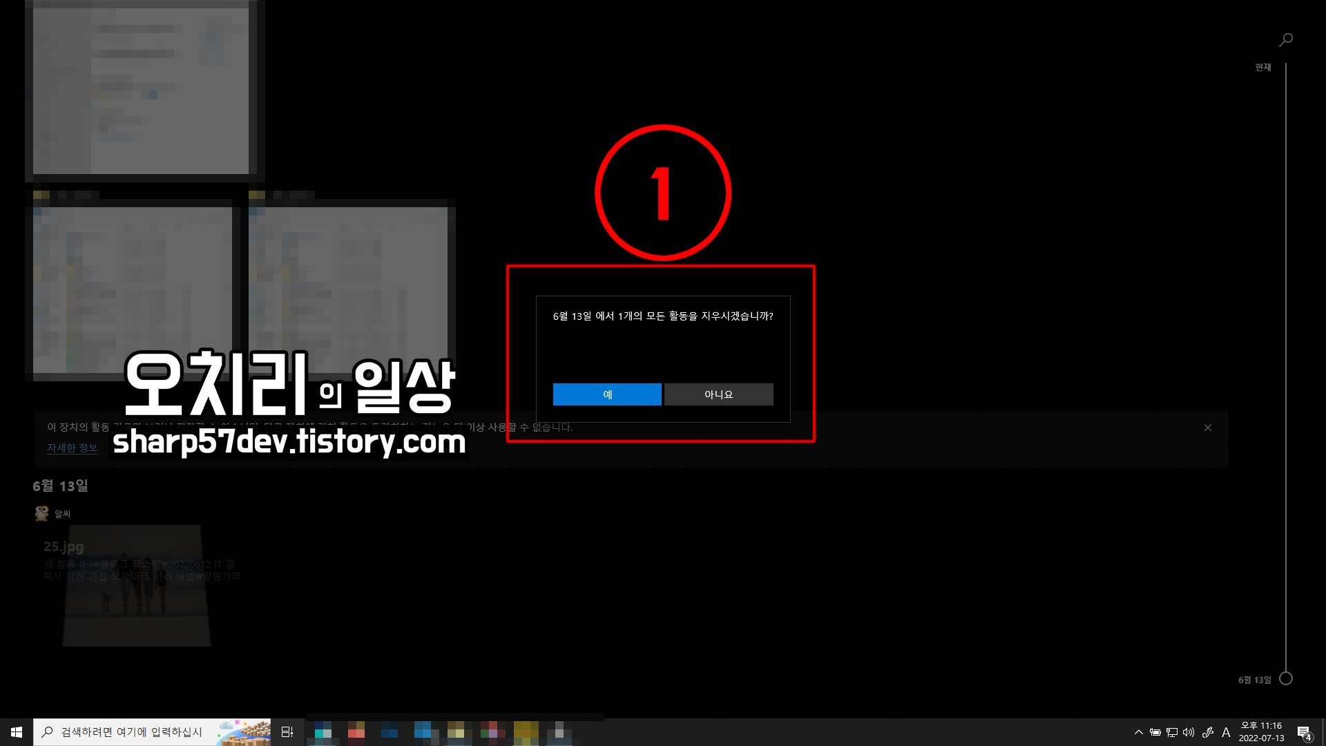 이렇게 ①[최근 활동]목록들을 일단 한 개씩 삭제해보도록 하겠습니다.