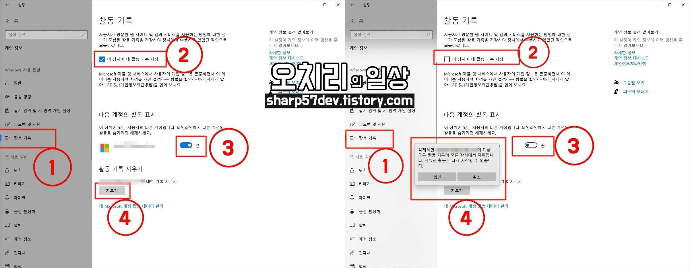 왼쪽의 ②[이 장치에 내 활동 기록 저장]을 오른쪽의 ②[이 장치에 내 활동 기록 저장]처럼 체크를 해제합니다.