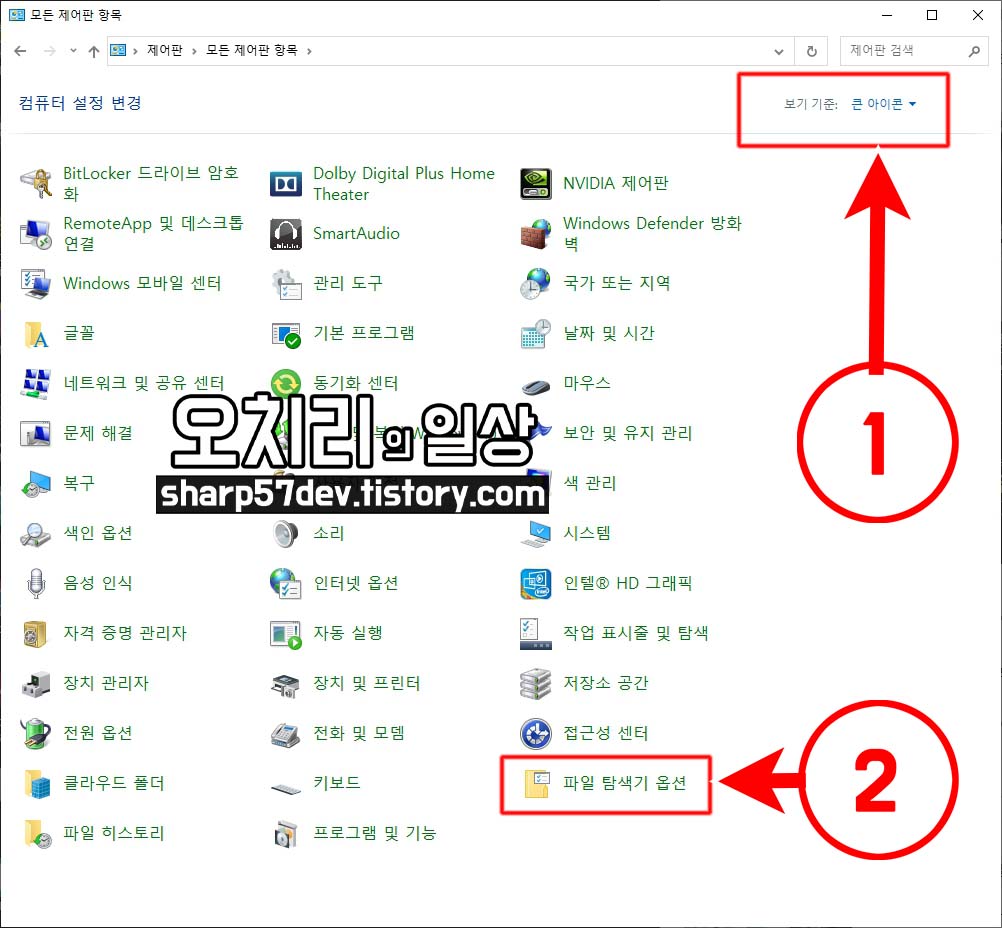 ①큰 아이콘으로 변경하니 ②[파일 탐색기 옵션]이 바로 찾아집니다.