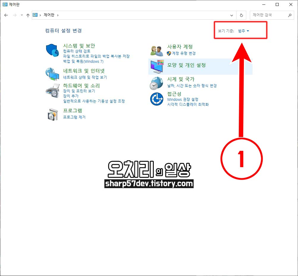 좀 더 편하게 메뉴를 찾아낼 수 있도록 ①[보기 기준]을 범주에서 => 큰 아이콘으로 변경합니다.