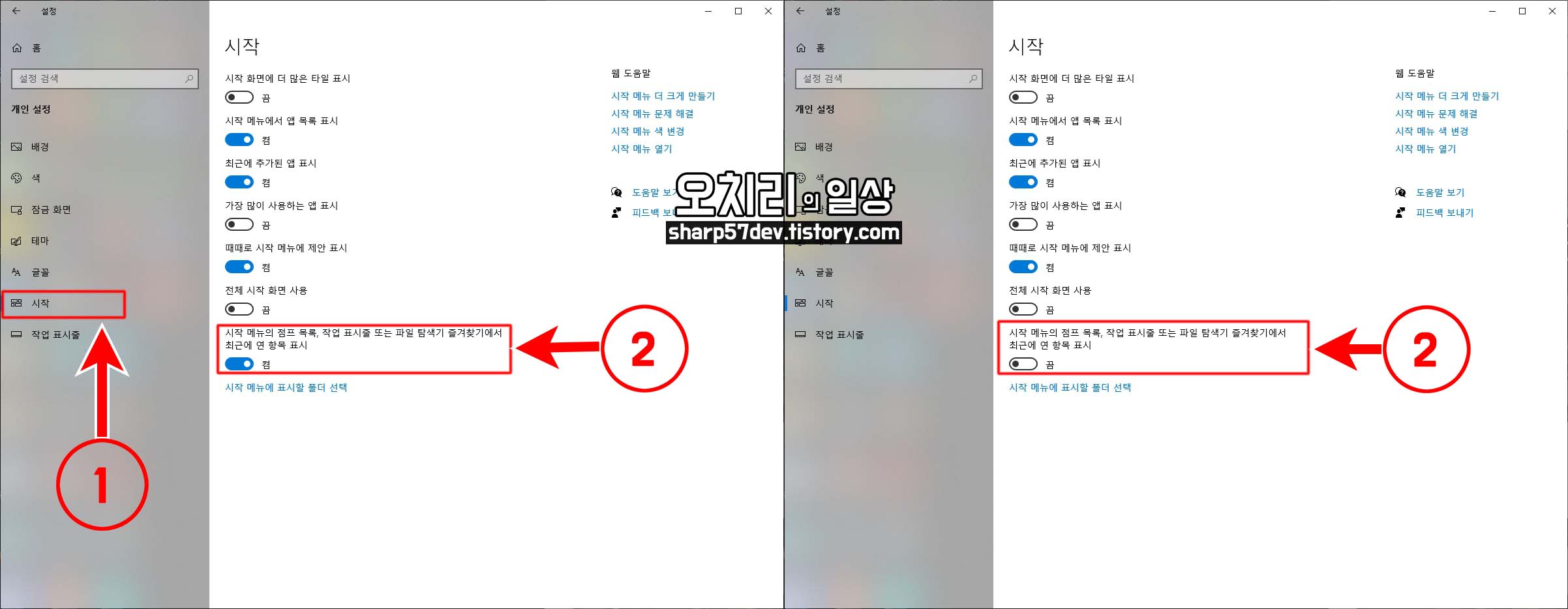 ②[시작 메뉴의 점프 목록, 작업 표시줄 또는 파일 탐색기 즐겨찾기에서 최근에 연 항목 표시]를
