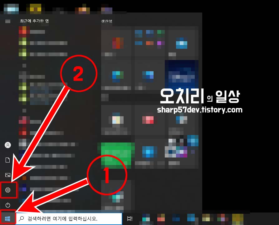 좌측 하단 ①[윈도우 시작] 버튼을 누른 후 ②[설정] 버튼 클릭으로 설정으로 진입합니다.