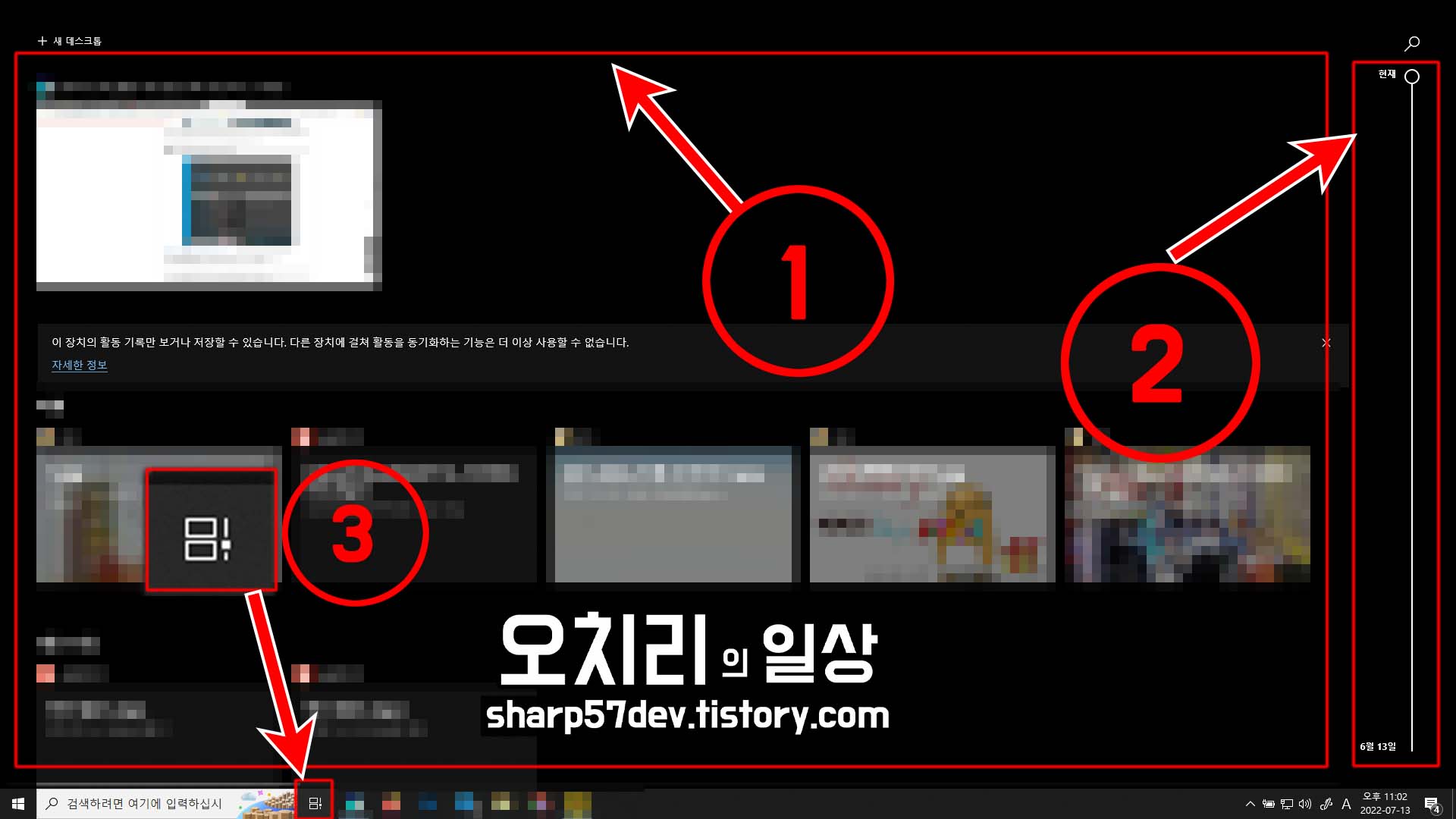 윈도우 화면에서 하단 윈도우 검색 입력창 오른쪽에 ③[작업 보기] 버튼을 누르면 위와 같은 타임라인 화면이 구성됩니다.