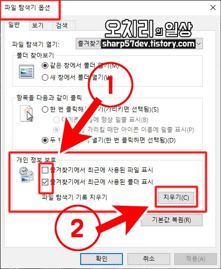 파일 탐색기 옵션에서 [일반] 탭에서 아래에 보면 [개인 정보 보호] 그룹이 있습니다
