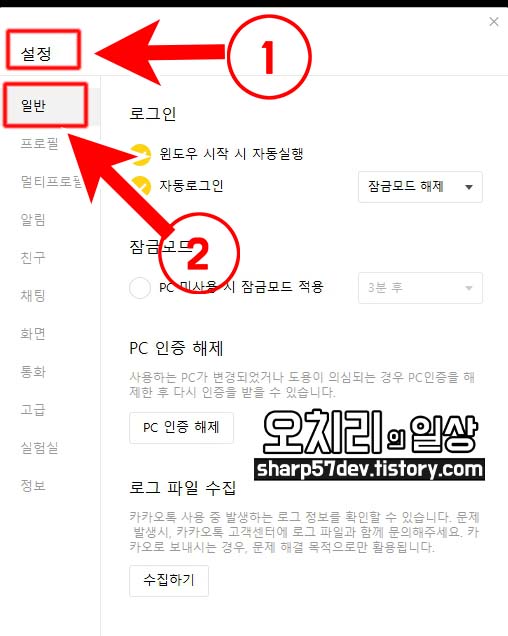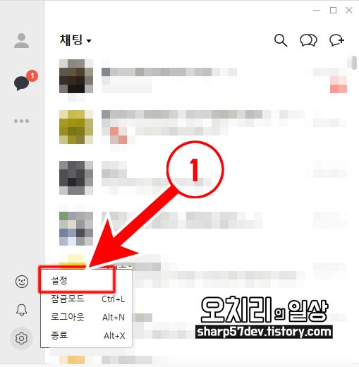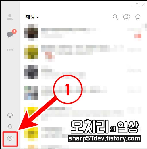 실행된 카카오톡의 좌측 하단에 ①[톱니바퀴 모양] 버튼을 클릭합니다.