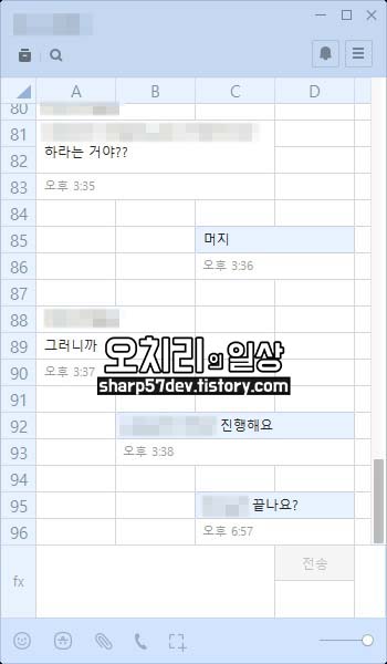 그래서 카카오톡은 이 컴퓨터 버전 카카오톡의 대화창을 근무시간에도 남에게 안들키고 톡을 할 수 있게 좀 더 신경을 써서 만들었는데요. 바로 카톡 대화창을 엑셀처럼 디자인하여 마치 근무시간에 정말 컴퓨터로 워드, 엑셀 프로그램들에 묻혀 자연스레 근무하는 것처럼 보이게 만들었습니다