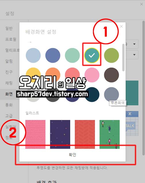 그럼 "배경화면 선택 옵션이 보이고 단색으로 할 것인지 일러스트로 할 것인지 정합니다. 저는 단색 ①초록색으로 고르고 ②[확인] 버튼을 클릭하여 카톡 채팅창의 배경화면을 변경합니다.
