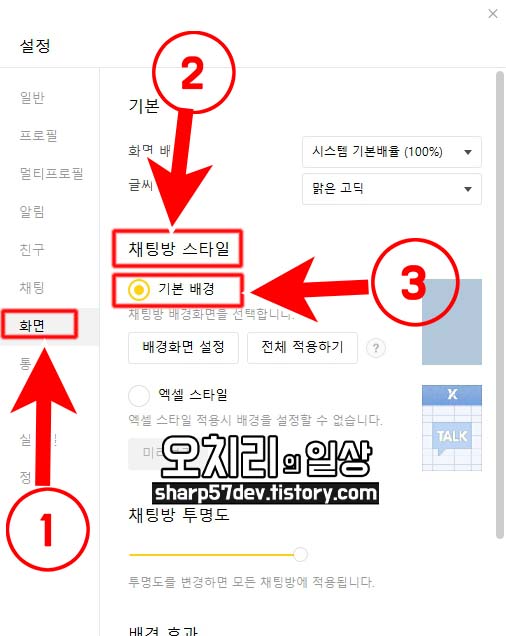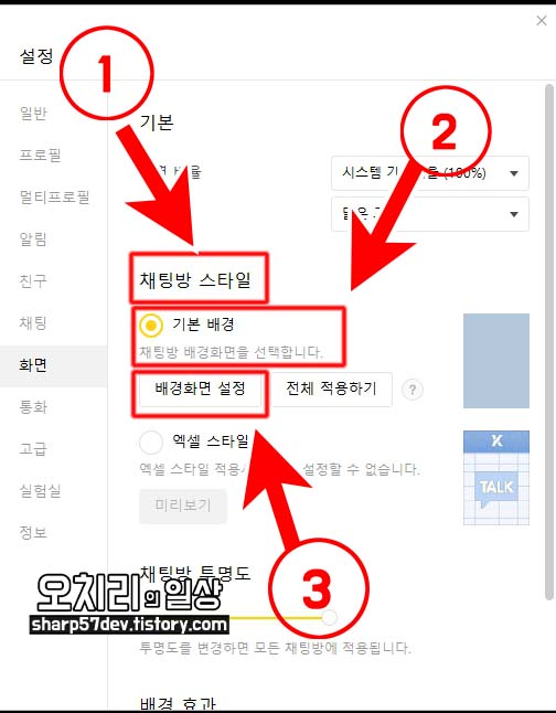 아까처럼.. 설정 > 화면 메뉴로 들어와서 ①[채팅방 스타일] 선택에서 ②[기본 배경]을 선택 클릭합니다. 그리고 ③[배경화면 설정] 버튼을 클릭합니다.