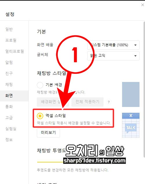 채팅방 스타일에서 "기본 배경"이 선택되어있는 것을 아래에 있는 ①[엑셀 스타일]을 선택 클릭합니다.