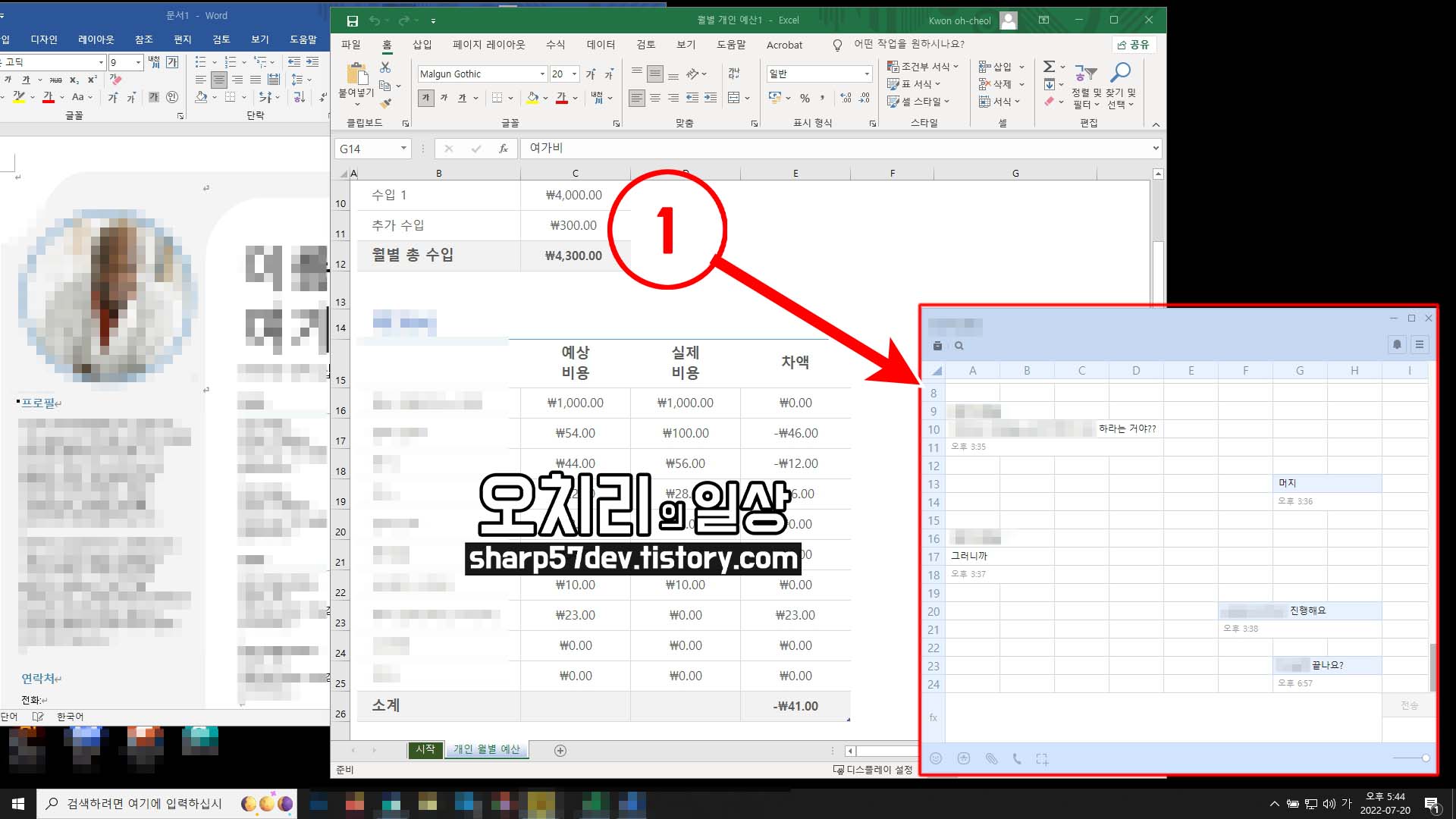 워드와 엑셀을 입력 또는 수정하는 것처럼 보이고 ①[엑셀 테마 카톡 채팅창]도 마치 같은 무리의 프로그램인 듯 자연스럽게 진짜 프로그램들에게 스며들었습니다.