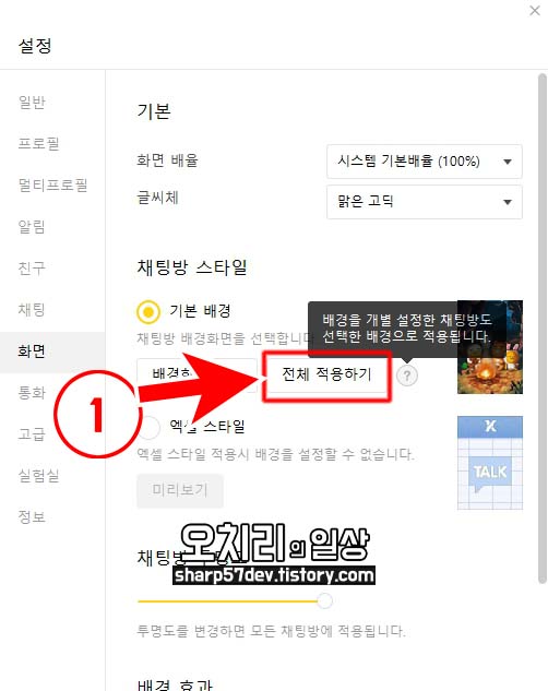 채팅방 스타일 선택메뉴에서 ①[전체 적용하기] 버튼이 있은데, 이 버튼은 "배경을 개별 설정한 채팅방도 선택한 배경으로 적용됩니다."라고 합니다.