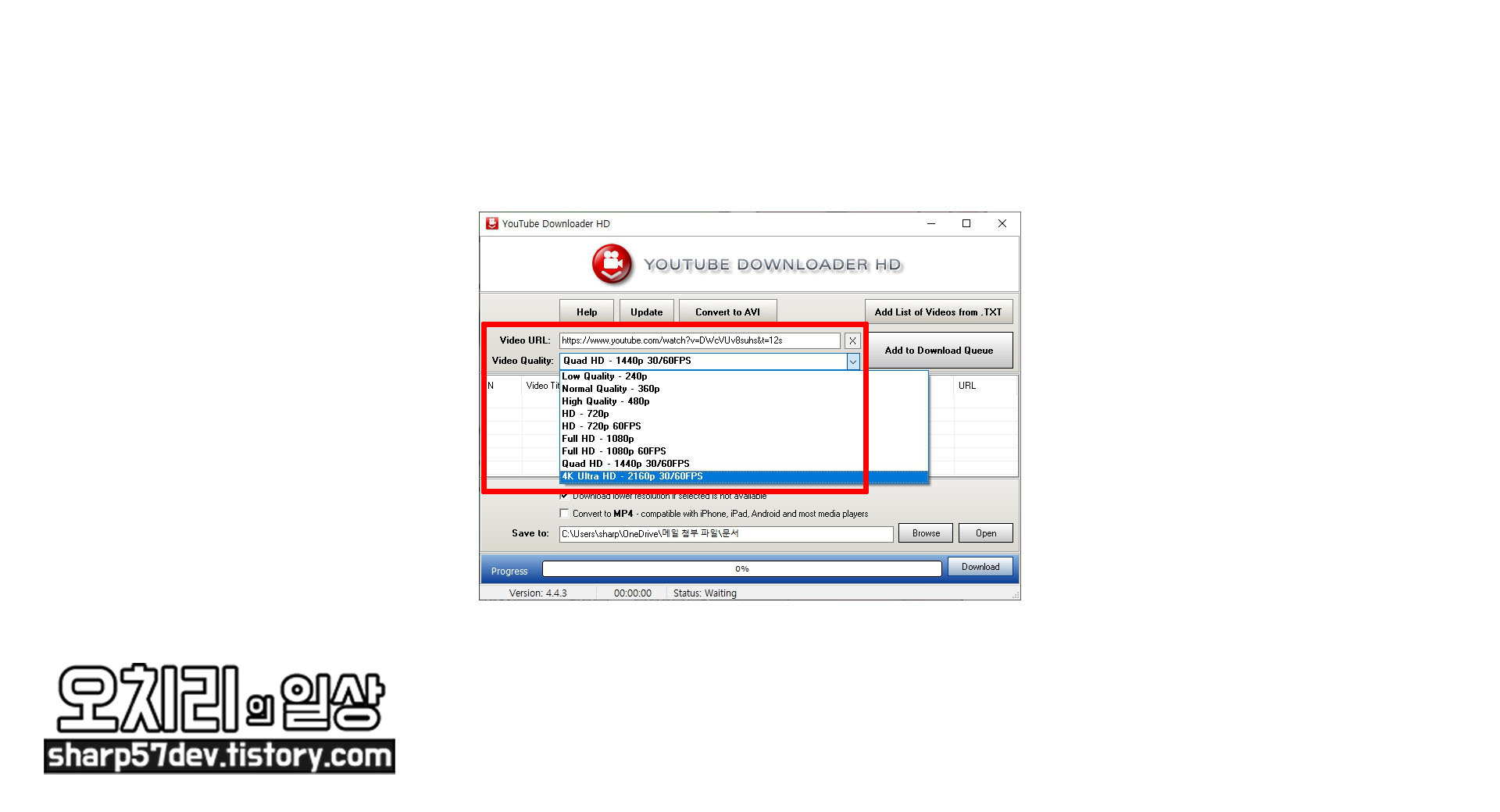 유튜브 동영상 url 주소를 입력하고 해상도를 선택하고 다운로드 목록에 추가합니다.