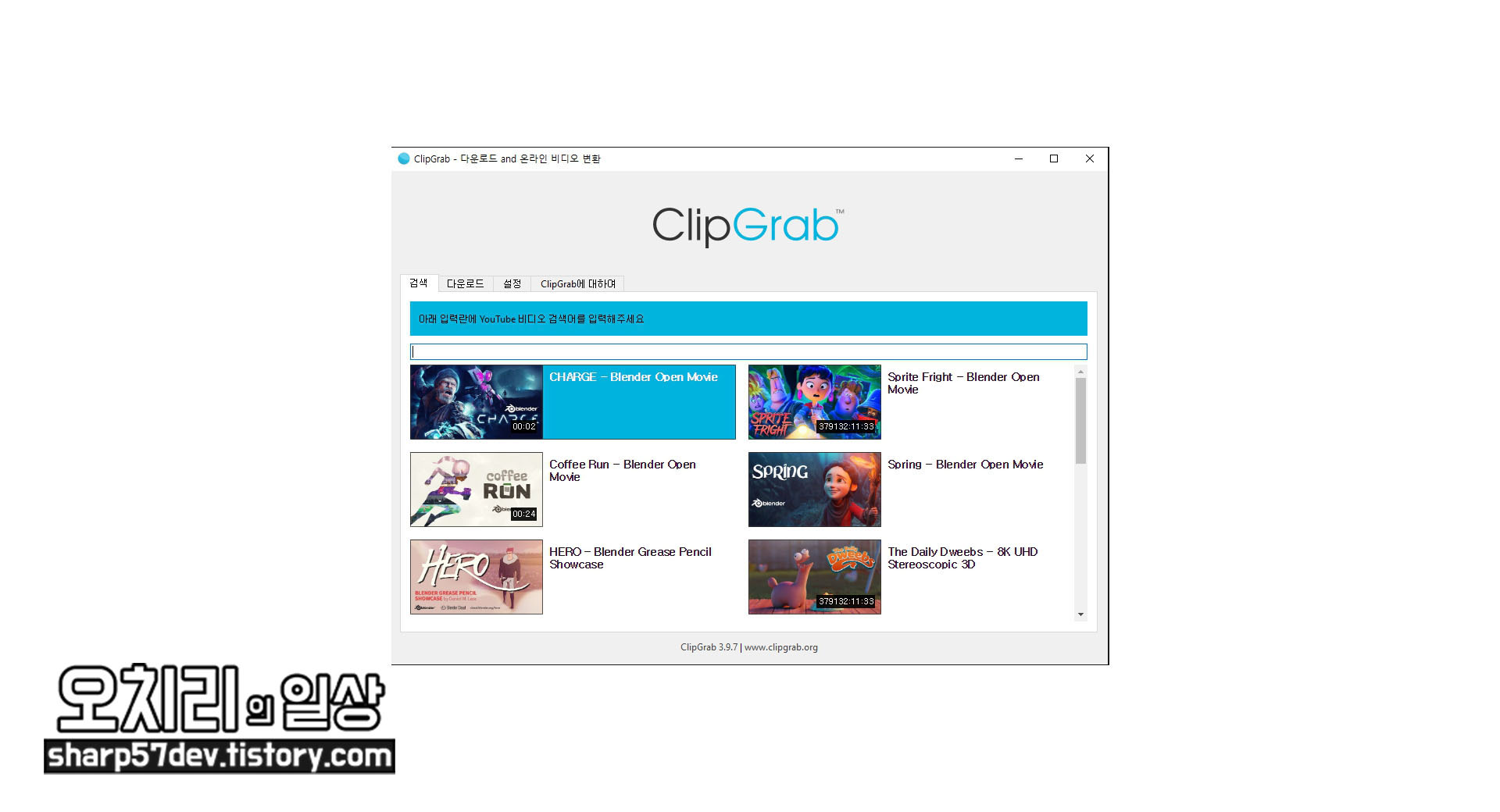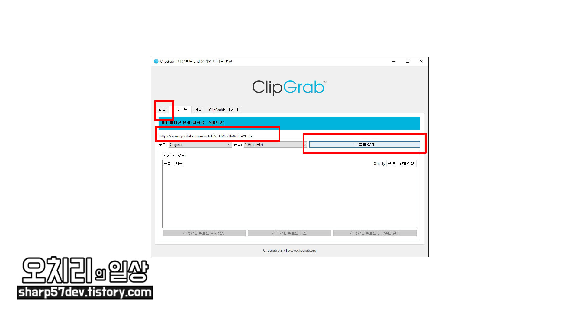 검색 탭을 누르신 후 빈칸에 유튜브 동영상 url 주소를 입력하시고 바로 아래 오른쪽 버튼 "이 클리 잡기!"를 누릅니다.