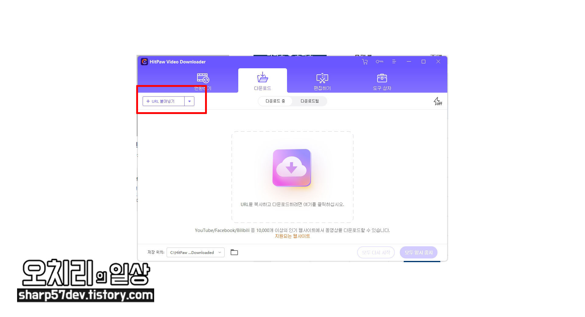 설치 후 프로그램을 실행합니다. 아까 유튜브에서 복사한 동영상 url 주소를 프로그램 왼쪽 위에 있는 url 붙여 넣기를 눌러 연결시킵니다.