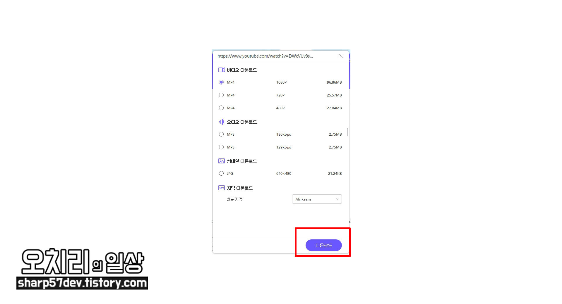 그럼 화면 아래에 유튜브 동영상 섬네일이 뜨고 다운로드할 화질과 버튼이 나타납니다.