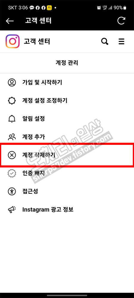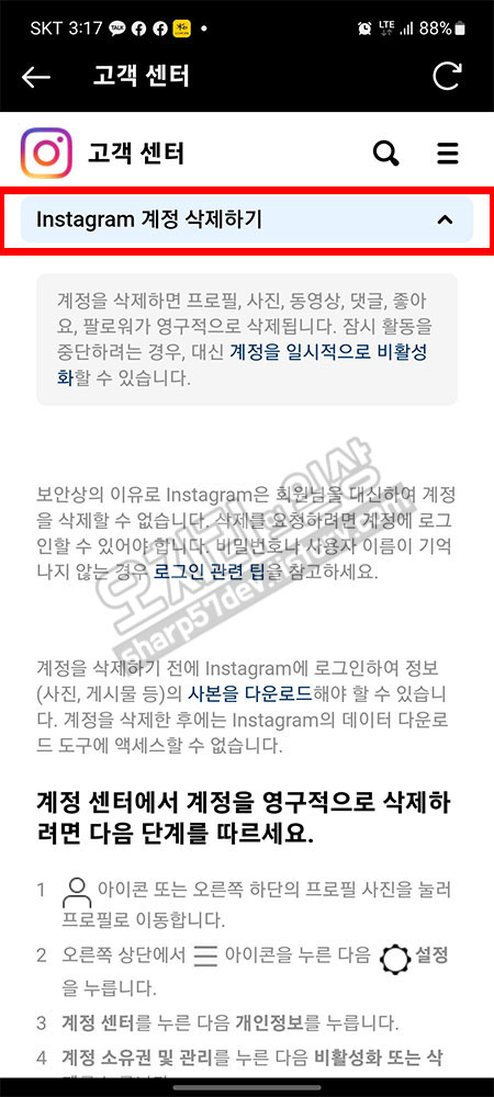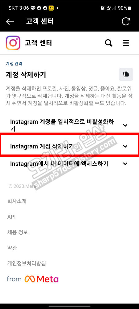 중 "Instagram 계정 삭제하기"를 선택 터치하여 펼쳐봅니다.
