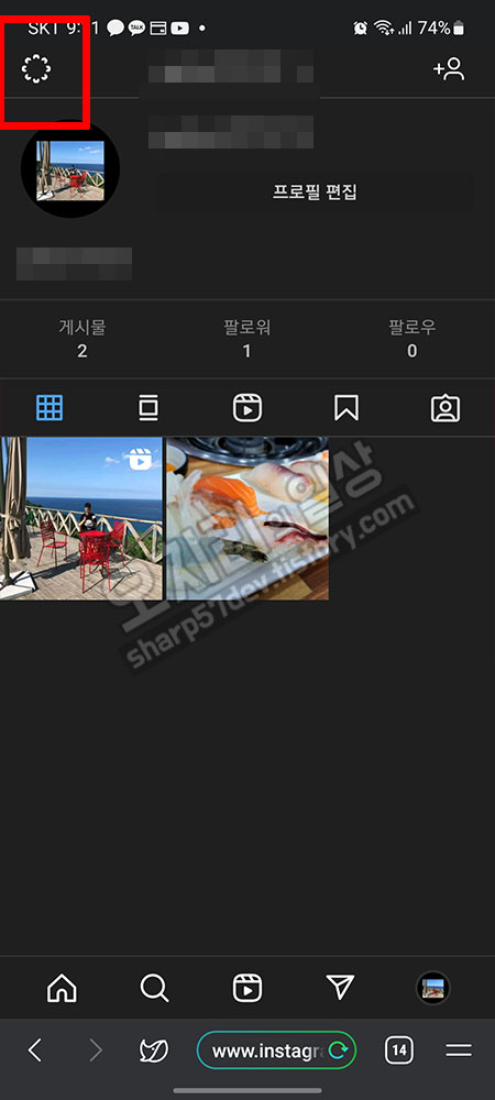 내 게시물이 있는 "내 인스타그램"에 들어옵니다. 앱에서는 오른쪽 위에 "더보기"버튼이 있었으나 웹사이트 인스타그램은 왼쪽 위에 톱니바퀴 모양의 "설정"버튼이 보입니다. 이 설정 버튼을 눌러 설정으로 들어가 보겠습니다.