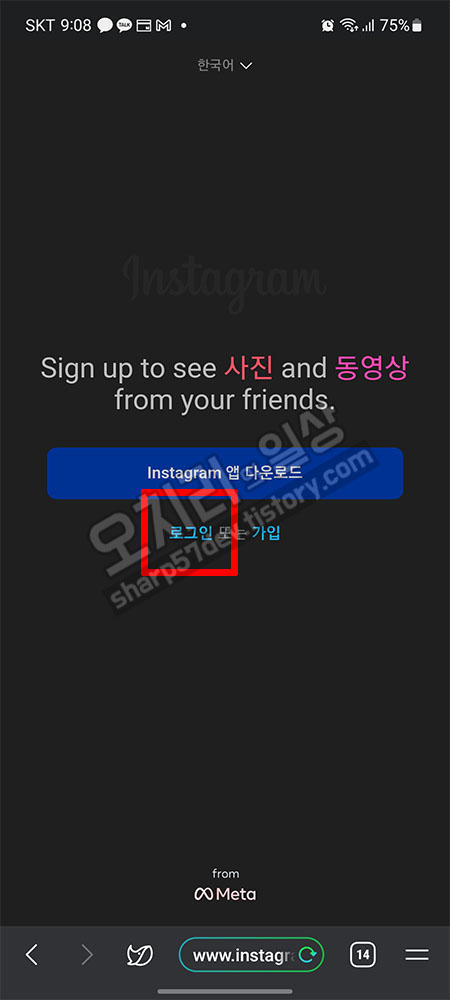 인스타그램 사이트로 이동합니다. 로그인 버튼을 누릅니다.