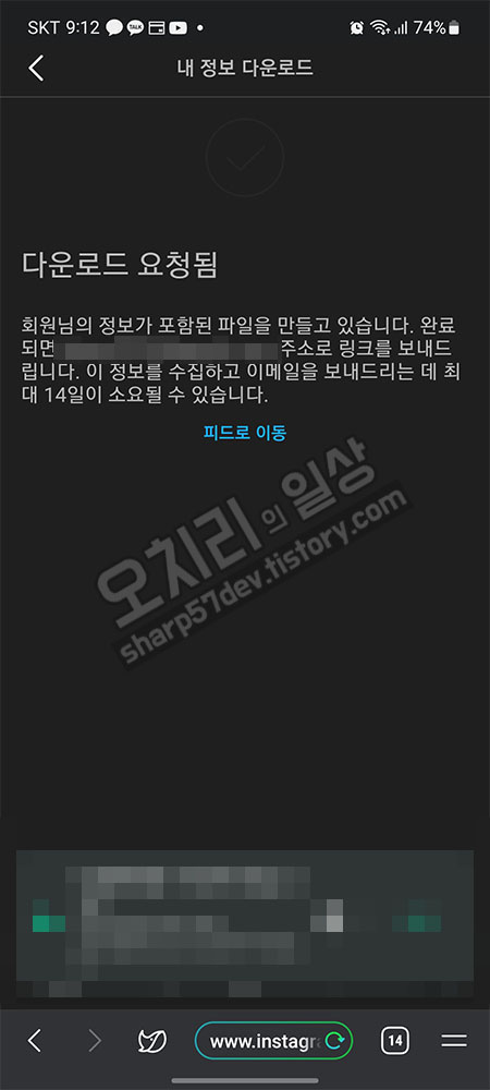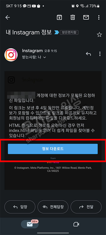 메일을 열어보면 - 내 계정에 대한 정보가 포함된 요청하신 파일입니다. 이 링크는 보낸 후 4일 동안만 유효합니다. 개인정보가 포함될 수 있으므로 링크를 비공개로 유지하고 회원님의 컴퓨터에서만 파일을 다운로드하세요. HTML형식으로 정보를 요청하신 경우 먼저 index.html 파일을 열어 더 쉽게 파일을 찾아볼 수 있습니다. - 라고 내용이 쓰여있습니다.