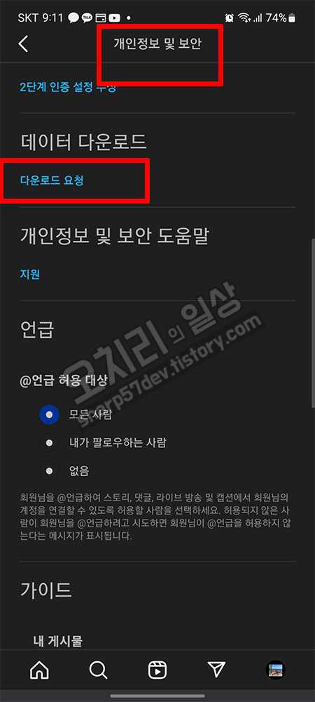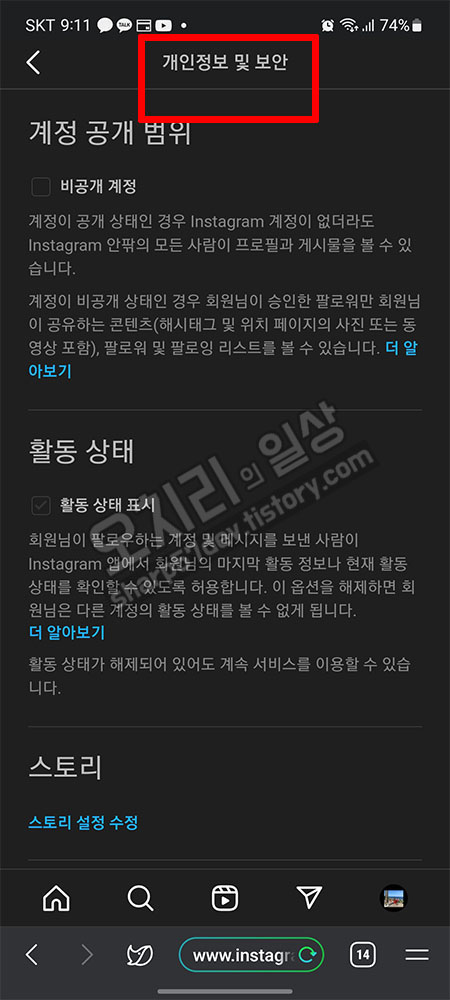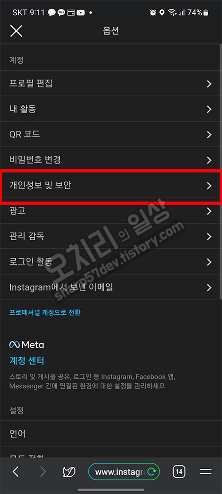 "개인 정보 및 보안"에 들어와 보시면 인스타그램 앱 하고는 전혀 다른 메뉴 구성인 것을 알 수 있습니다.