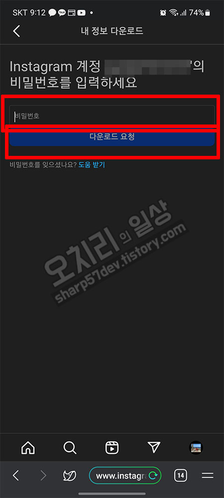그럼 마지막으로 인스타그램 비밀번호를 입력하고 "다운로드 요청"을 터치합니다.