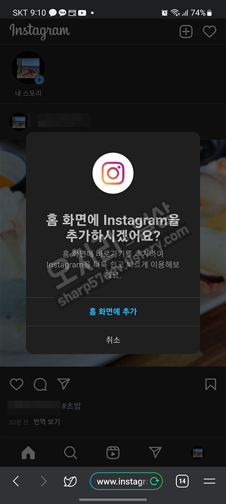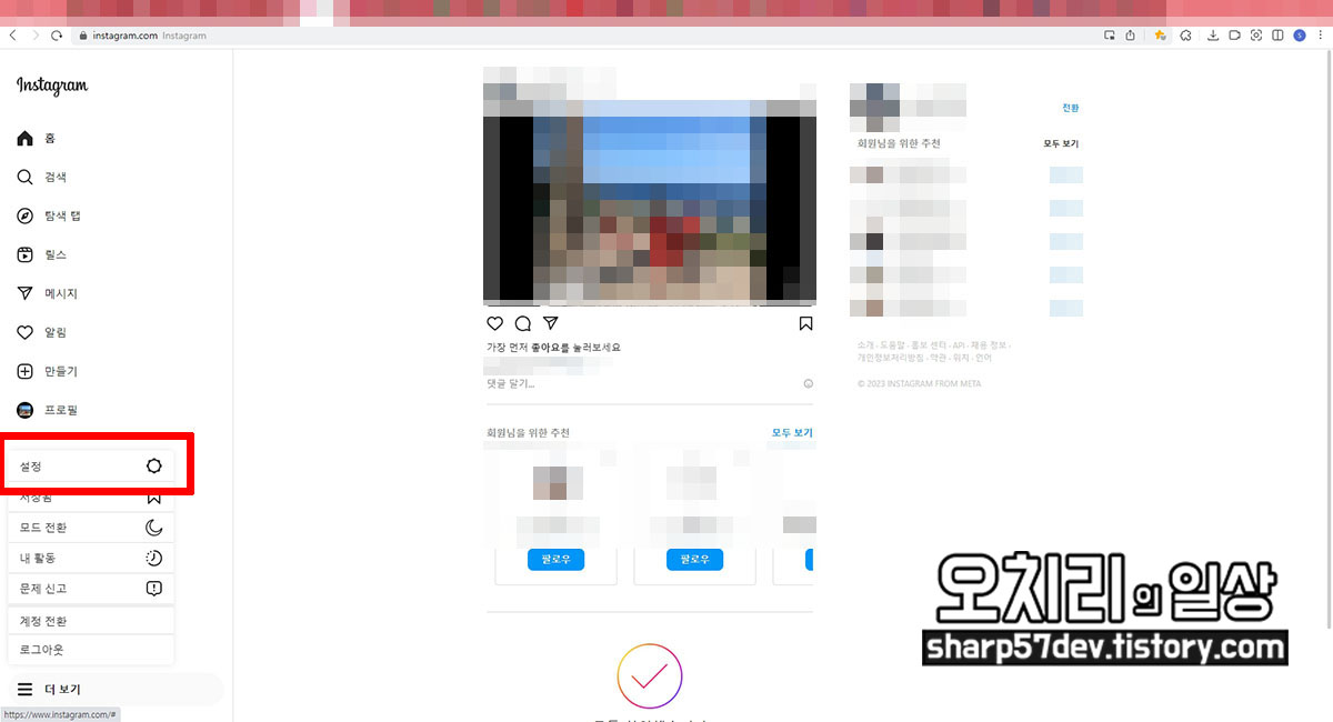 인스타그램 웹브라우저로 진입했습니다. 같은 인스타그램이지만 앱과 인터넷 브라우저와는 다른 점이 꽤 있습니다.