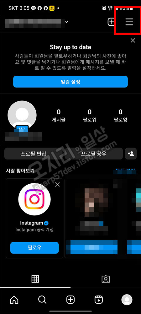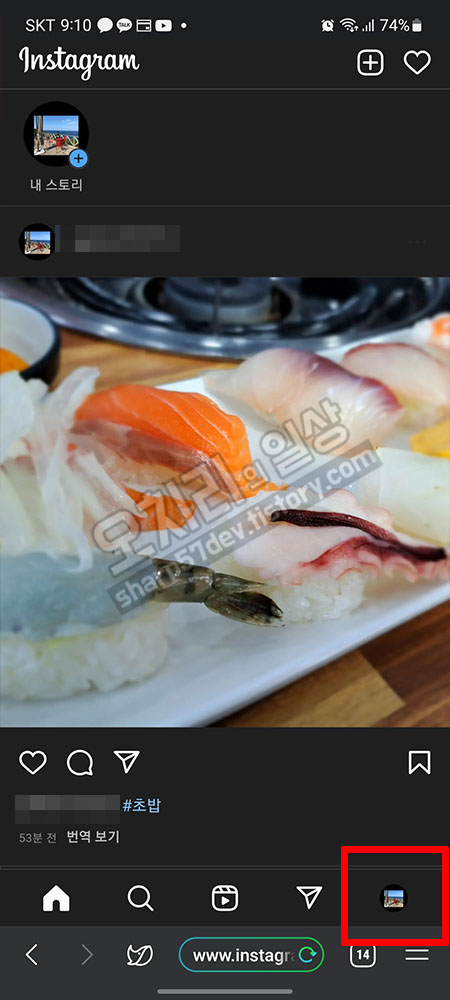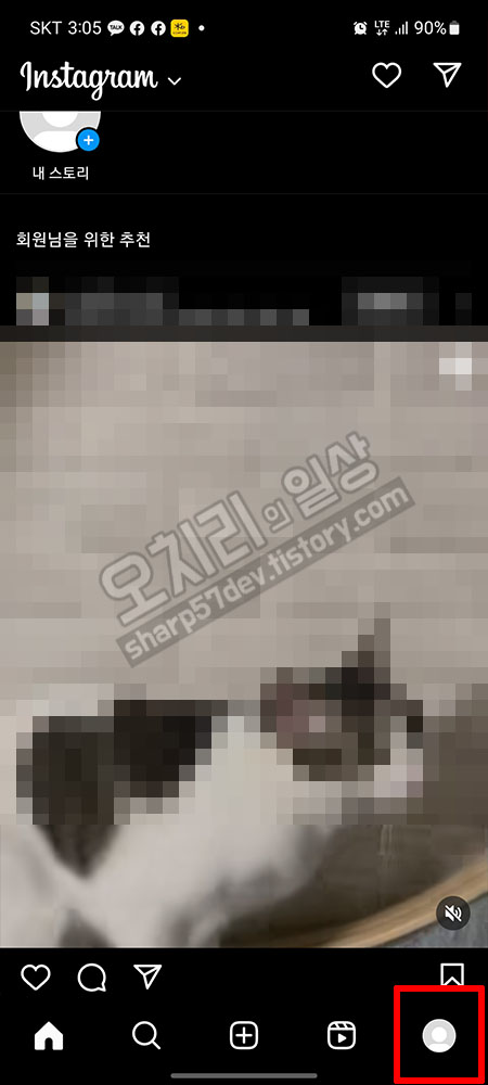인스타그램에 로그인이 됩니다. 오른쪽 아래 "내 인스타그램"탭을 선택 터치합니다.