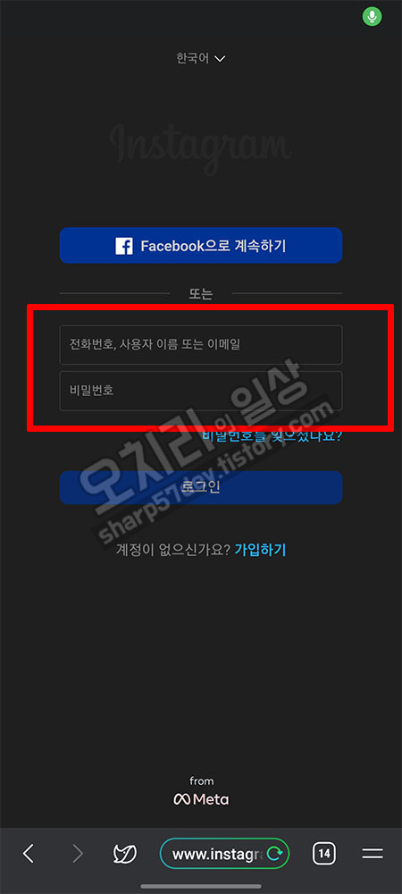 위에서 해보았듯이 브라우저 주소 창에 url "www.instagram.com"이라 입력하고, 이동한 사이트에서 인스타그램 로그인을 합니다.