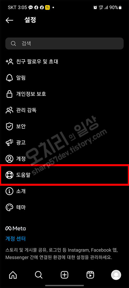 설정메뉴로 들어옵니다. 여기에도 여러 메뉴가 있지만, 그중에서 "도움말"메뉴를 선택 터치합니다.