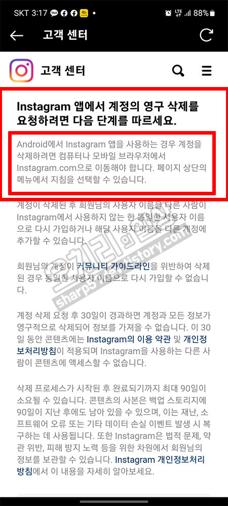 아래로 스크롤하다 보면 "Instagram 앱에서 계정의 영구 삭제를 요청하려면 다음 단계를 따르세요."라고 내용이 보입니다.