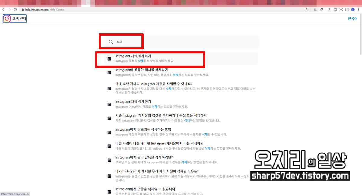 "삭제"로 검색을 하면 검색된 내용 중에 "Instagram 계정 삭제하기" 내용이 있습니다. 이를 클릭합니다.