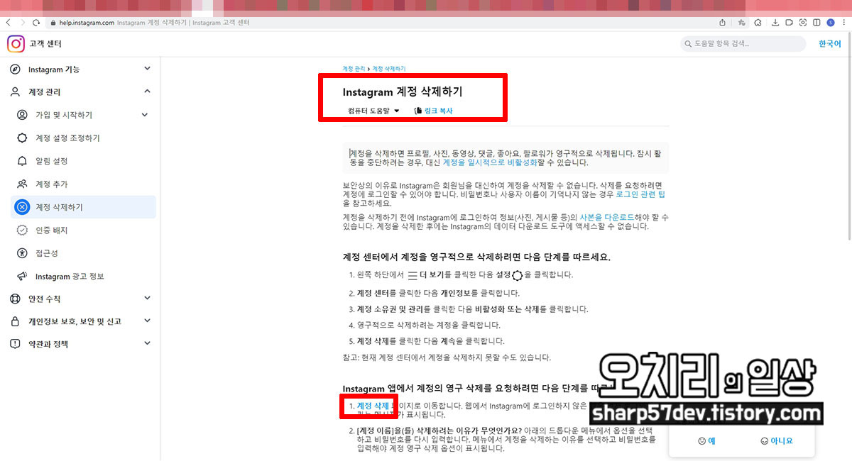 내용 중에 "Instagram 앱에서 계정의 영구 삭제를 요청하려면 다음 단계를 따르시오"라는 부제목이 있고 그 내용중에 파란 글씨로 "계정 삭제"라는 텍스트를 클릭합니다.