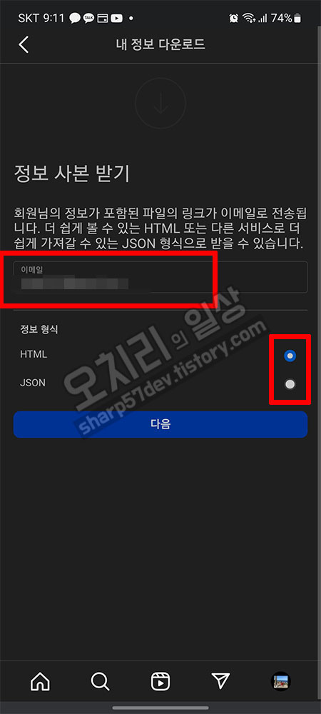 데이터 사본을 받을 이메일을 적으시고 HTML로 받으실지 JSON방식으로 받으실지 선택하시고 "다음" 버튼을 누르시면 됩니다.