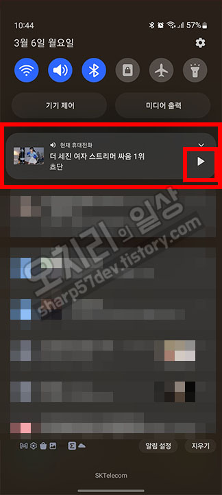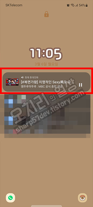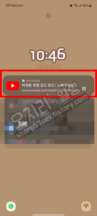 알림창이 나오고 그 위에 방금 전에 봤던 인터넷의 컨텐츠가 일시 정지 되어있음을 볼 수 있습니다. 이 일시 정지 버튼을 눌러 다시 재생합니다. 그러면 바탕화면 또는 화면이 꺼진 상태에서도 오디오가 플레이되는 것을 볼 수 있습니다.
