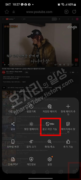 여러 메뉴들이 보입니다. (다운로드, 방문기록, 저장할 페이지, 광고 차단 기능 등등)