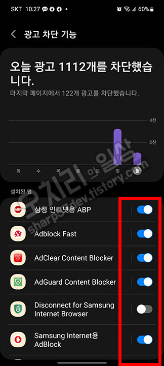 "광고 차단 기능"을 터치하시면, 위와 같이 삼성 인터넷 브라우저 광고 설정 체크 화면이 나옵니다.
