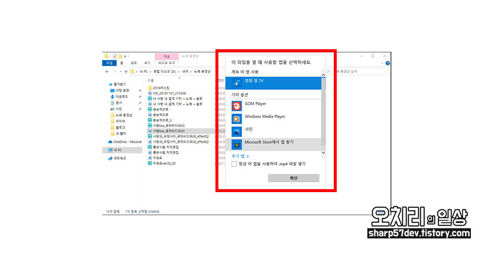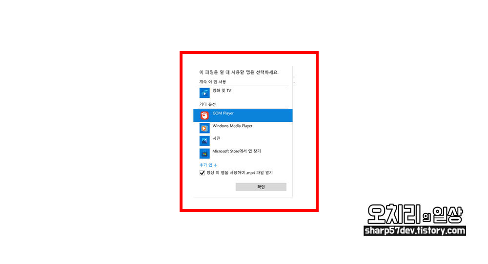 확인 버튼 위에 "항상 이 앱을 사용하여 .mp4 파일 열기" 버튼에 체크하고 확인을 누르면 이후부터는 선택된 파일로 실행되는 것을 확인할 수 있습니다.