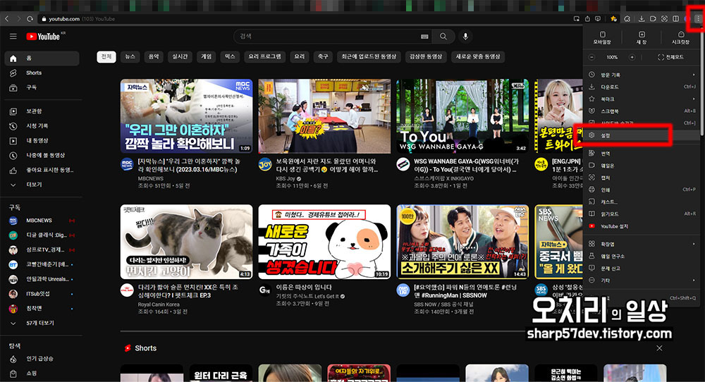 인터넷 주소에 주소를 넣고 유튜브를 열었습니다.