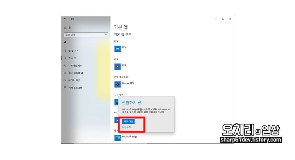 기본 브라우저 교체 전에 <체크 아웃><전환하기> 중 선택하라는데 저는 <전환하기>를 클릭했습니다.