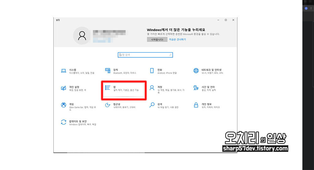 어러 설정버튼 중에 "앱"설정 버튼을 누릅니다.