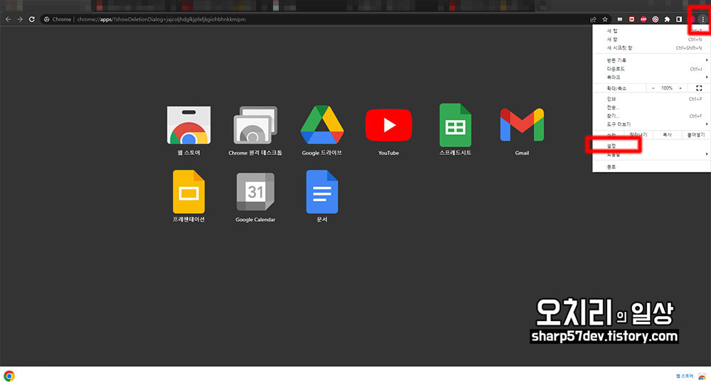 크롬 브라우저를 실행합니다. 그리고 브라우저 오른쪽 위에 점 세게 짜리 더 보기 버튼을 눌러 메뉴를 더 불러옵니다.