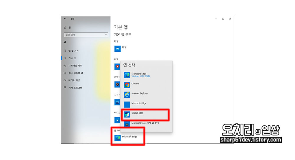 기본 앱을 클릭하여 새로운 기본 앱으로 바꿀 수 있는 리스트들이 옆에 나타납니다.