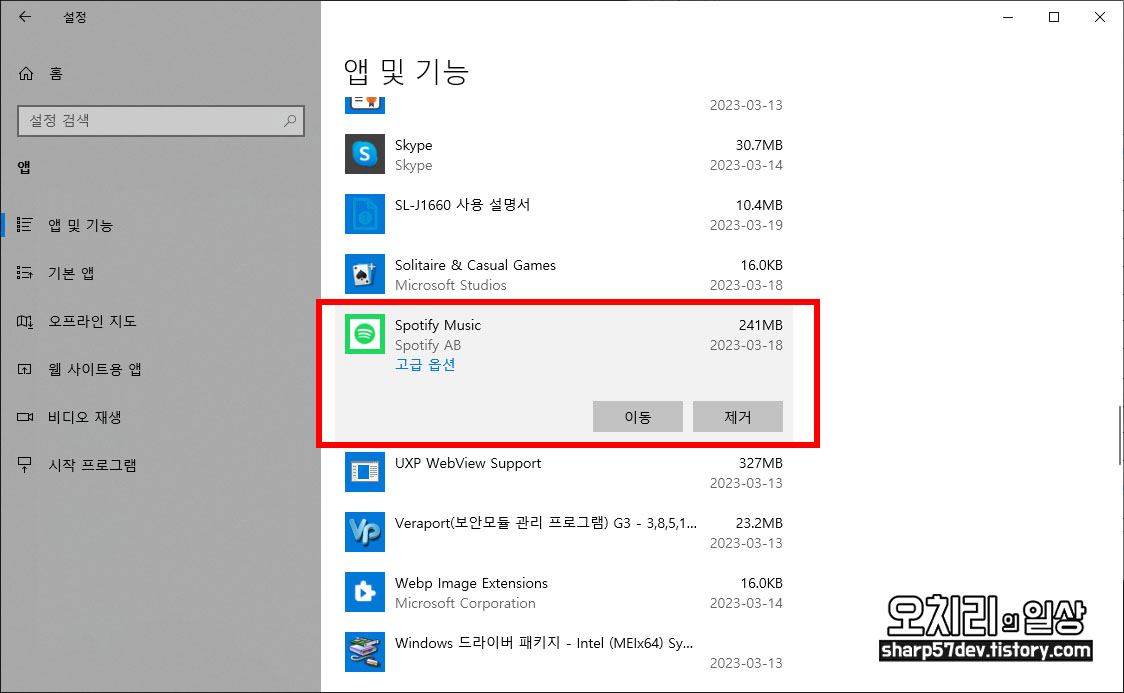 그 앱 리스트에서 Spotify Music 이라는 파일을 찾았고 이 리스트에서 클릭을 하여 "이동", "제거" 옵션이 나타납니다.