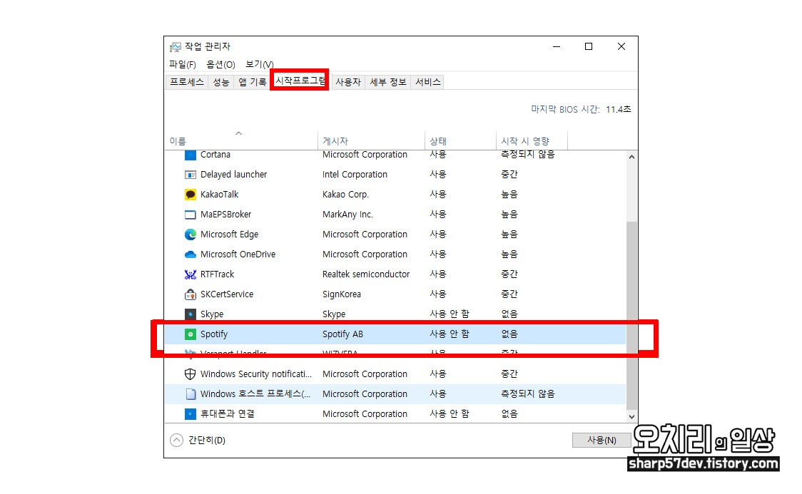 마지막으로 "작업 관리자"를 다시 열어서 > 시작 프로그램을 열어서 "Spotify"를 찾아봅니다.